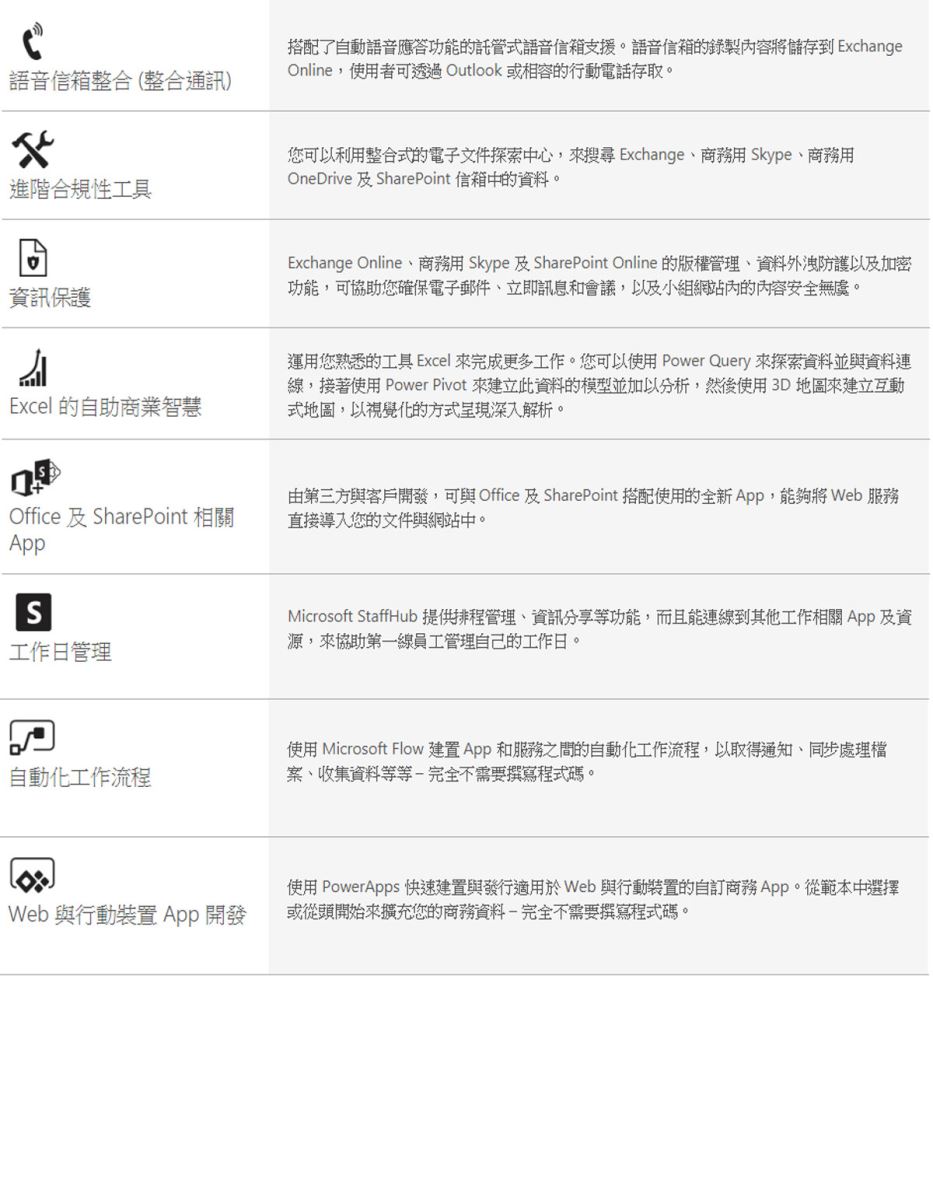 ●進階電子郵件封存(無上限儲存空間)、進階法規遵循設定如DLP