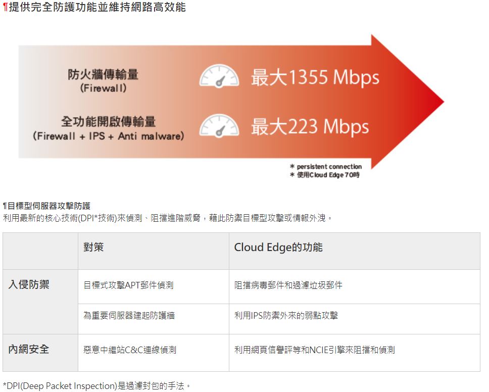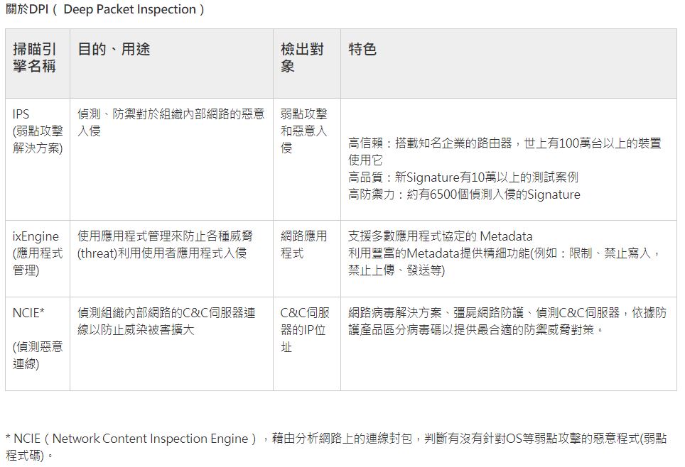 1.利用最新的核心技術(DPI*技術)來偵測、阻擋進階威脅,藉此防禦目標型攻擊或情報外洩。
