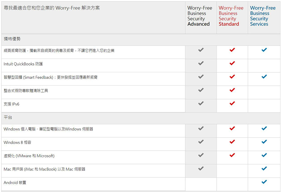 Worry-Free Business Security Services 是一套代管式端點解決方案,能防範病毒、危險網站以及其他威脅。這是一套雲端 (代管式) 服務,因此不需伺服器,也不需維護,安裝非常輕鬆,管理也非常容易。