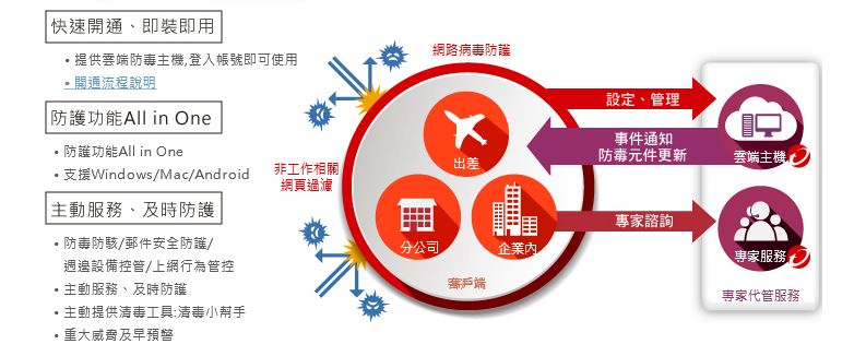 雲端代管,不必自建防毒主機,免除維護人力,開通流程簡單