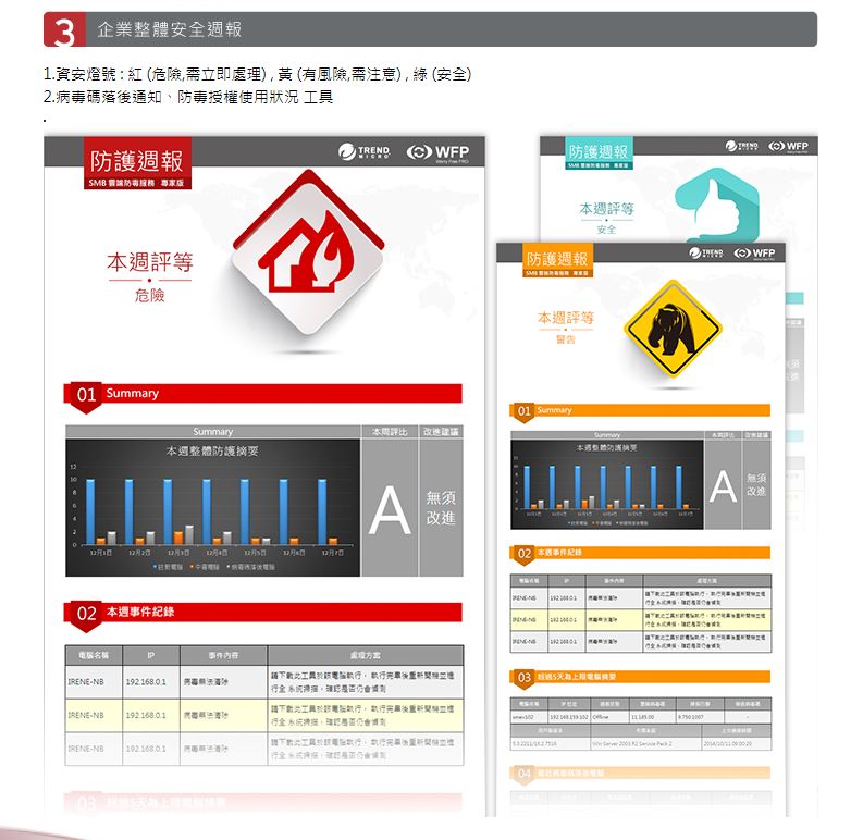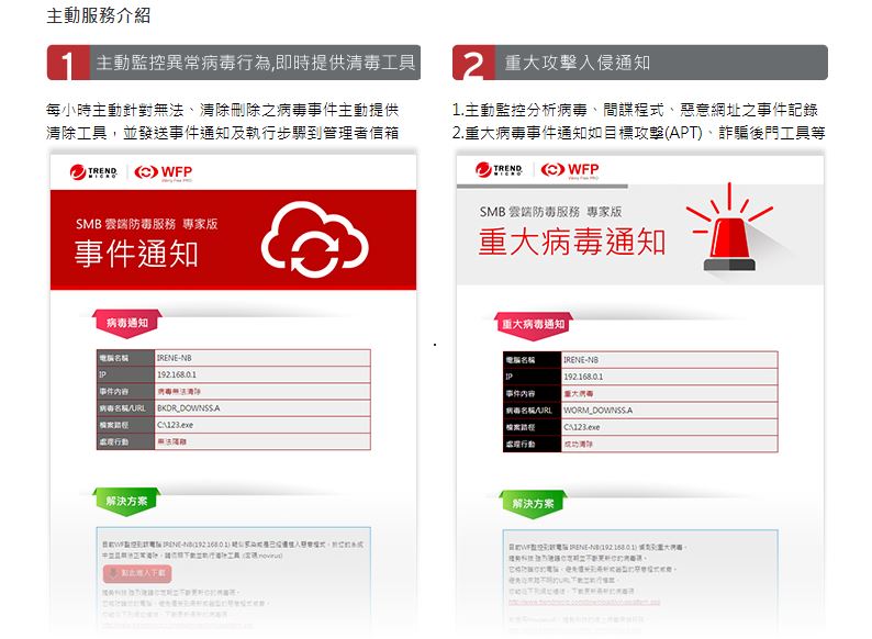 趨勢科技專家介入中小企業資安,做您的資安後盾,幫企業監控與分析資安報表,一旦觀察到可疑事件,如進階持續性滲透攻擊(APT)、詐騙後門入侵等, 即刻主動通知企業,並共同討論如何進一步處理