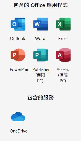 • 取得電腦版 Office 應用程式:Outlook、Word、Excel、PowerPoint、OneNote (外加僅提供 PC 版的 Access 和 Publisher)。